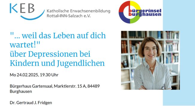 Die Katholische Erwachsenenbildung Rottal-INN-Salzach e.V. (KEB) organisiert zusammen mit der Bürgerinsel Burghausen e.V. einen Vortrag über Depressionen bei Kindern und Jugendlichen. Vortrag und Gespräch Depressionen bei Kindern und Jugendlichen werden leicht übersehen. Zum einen, da Symptome wie Traurigkeit oder Ängstlichkeit bei ihnen weniger ernst genommen werden, vor allem in der Pubertät. Zum anderen, weil sich…