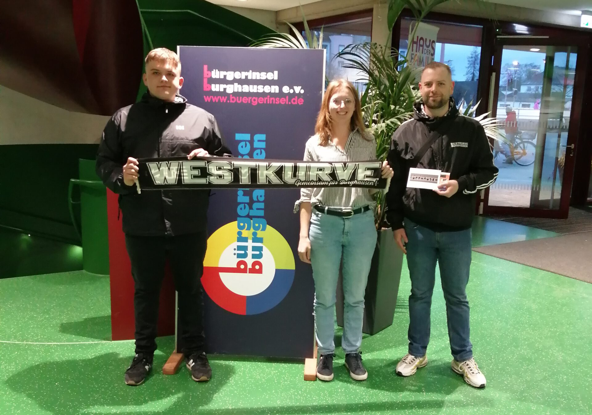Mit großer Freude nahm Veronika Irl, Mitarbeiterin der Bürgerinsel Burghausen e.V., symbolisch die Spende von 300€ des Fanclub Wacker Westkurve entgegen. Die Spenden kamen durch das Fan Turnier und den Kalenderverkauf des Fanclubs zusammen und sollen nun Burghauser Bürger*innen in Not zugutekommen.
